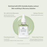 The vegan formula contains 85% of Centella Asiatica Extract that inhabits in pure areas of India, which is effective for skin conditioning and soothing.