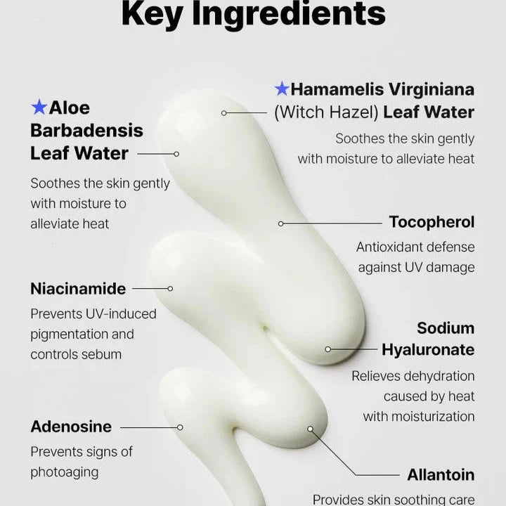 Aloe Barbadensis Leaf Water, Diethylhexyl Succinate, Propanediol, Aqua/Water, Drometrizole Trisiloxane, Ethylhexyl Triazone, Niacinamide, Diethylamino Hydroxybenzoyl Hexyl Benzoate, Terephthalylidene Dicamphor Sulfonic Acid, 1,2-Hexanediol, Behenyl Alcohol, Methyl Trimethicone, Sodium Polyacryloyldimethyl Taurate, Hamamelis Virginiana (Witch Hazel) Leaf Water, Tromethamine, Polyacrylate Crosspolymer-6, Arachidyl Alcohol, Caprylyl Glycol, Ethylhexylglycerin, Arachidyl Glucoside, Sodium Metaphosphate, Adenosine, Tocopherol, Sodium Hyaluronate, Allantoin, Citric Acid, Sodium Benzoate, Potassium Sorbate