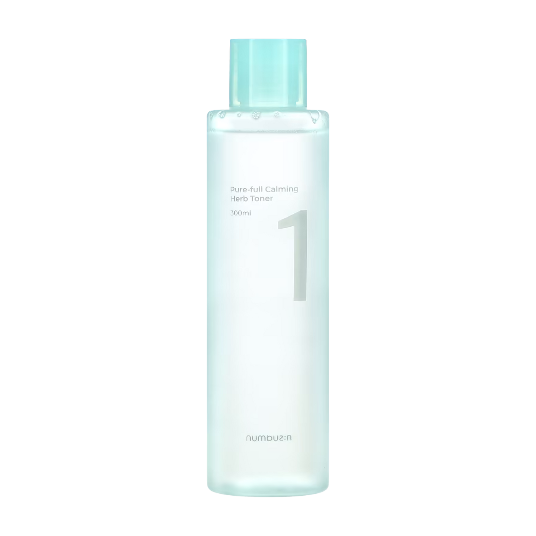 The Numbuzin No.1 Pure-Full Calming Herb Toner is formulated for acne-prone and sensitive skin, targeting excess sebum and soothing irritation.